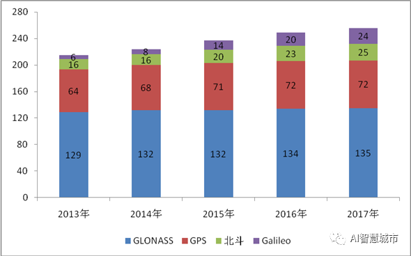 图9 2013-2017年全球四大卫星导航系统累计发射卫星数