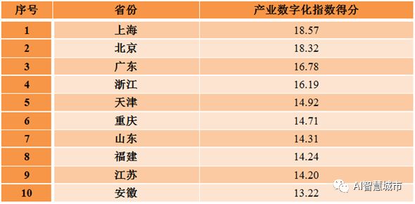 上海、北京、广东、浙江、天津、重庆、山东、福建、江苏、安徽等10个地方位列各省(区、市)产业数字化指数排名前十位。上述地区积极推动信息技术在制造业、农业、服务业深度应用,全面推进信息化和工业化深度融合,推动电子商务提档升级,创新产业生产模式和组织方式,带动产业资源灵活高效配置,产业数字化转型的创新活力和核心竞争力明显提升。