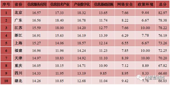 北京、浙江、江苏、上海、广东、福建、天津、湖北、辽宁、重庆等10个地方位列各省(区、市)信息基础设施指数排名前十位。上述地区大力推进城乡固定宽带网络建设普及,加快实施“光进铜退”改造,扩大4G移动通信网络覆盖,深入推进网络提速降费,全面落实电信普遍服务工作,区域信息基础设施支撑能力全面提升,数字红利有效释放。