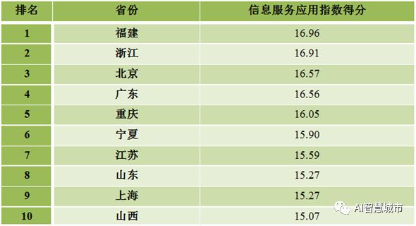 福建、浙江、北京、广东、重庆、宁夏、江苏、山东、上海、山西等10个地方位列各省(区、市)信息服务应用指数排名前十位。上述地区高度重视信息技术对公共服务效能的提升作用,推动互联网广泛普及,全面开展“互联网+政务服务”,让信息多跑路,群众少跑腿。积极推动教育、医疗健康、社会保障、文化等信息服务城乡覆盖,信息惠民便民深入发展,群众满意度明显提升。